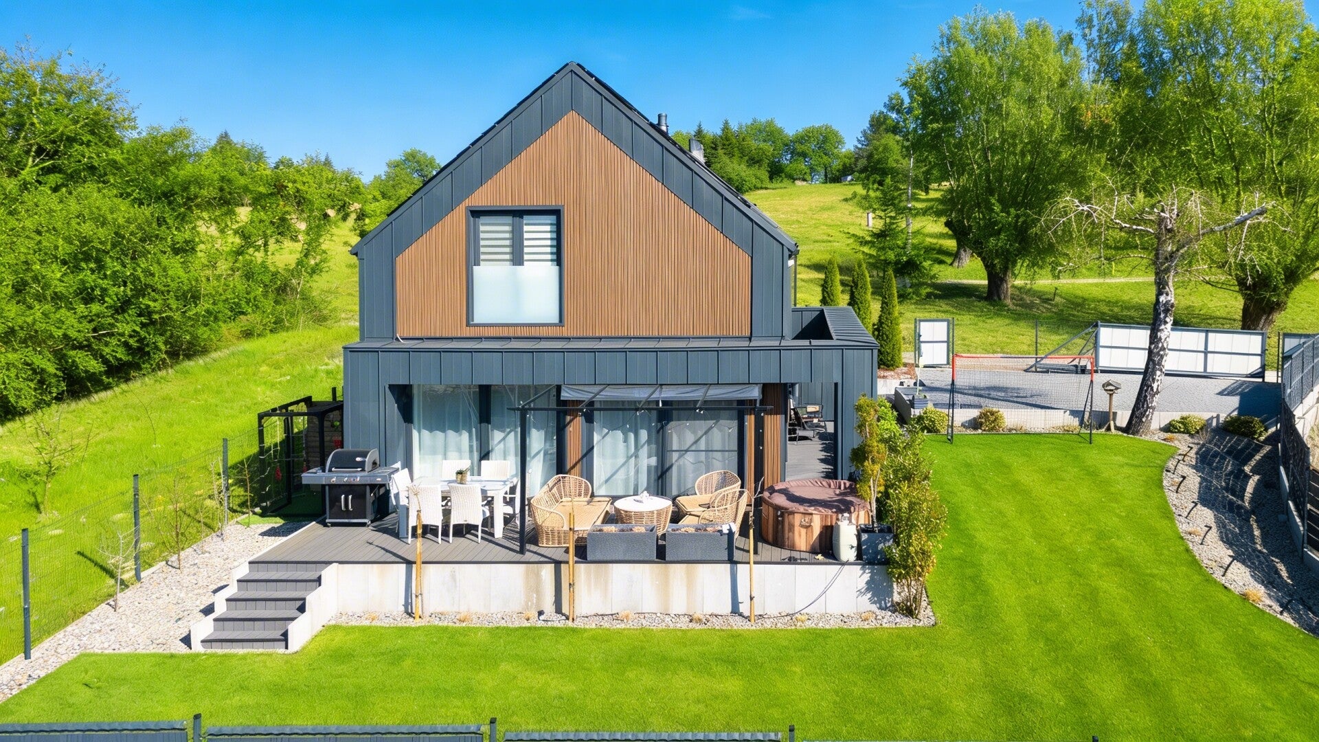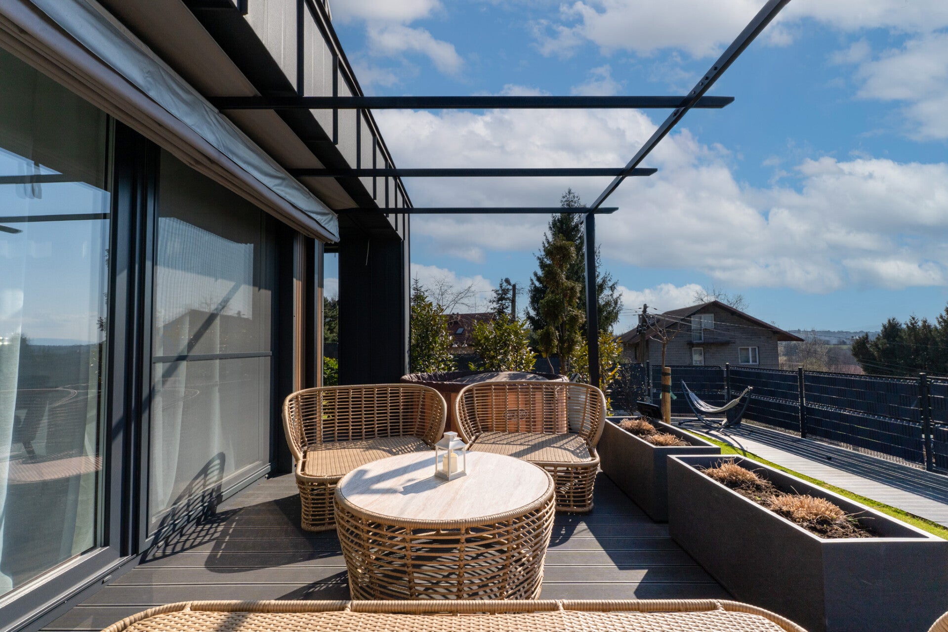 - dwa duże tarasy (ekspozycja południowa oraz wschodnia)jacuzzi oraz meble ogrodowe