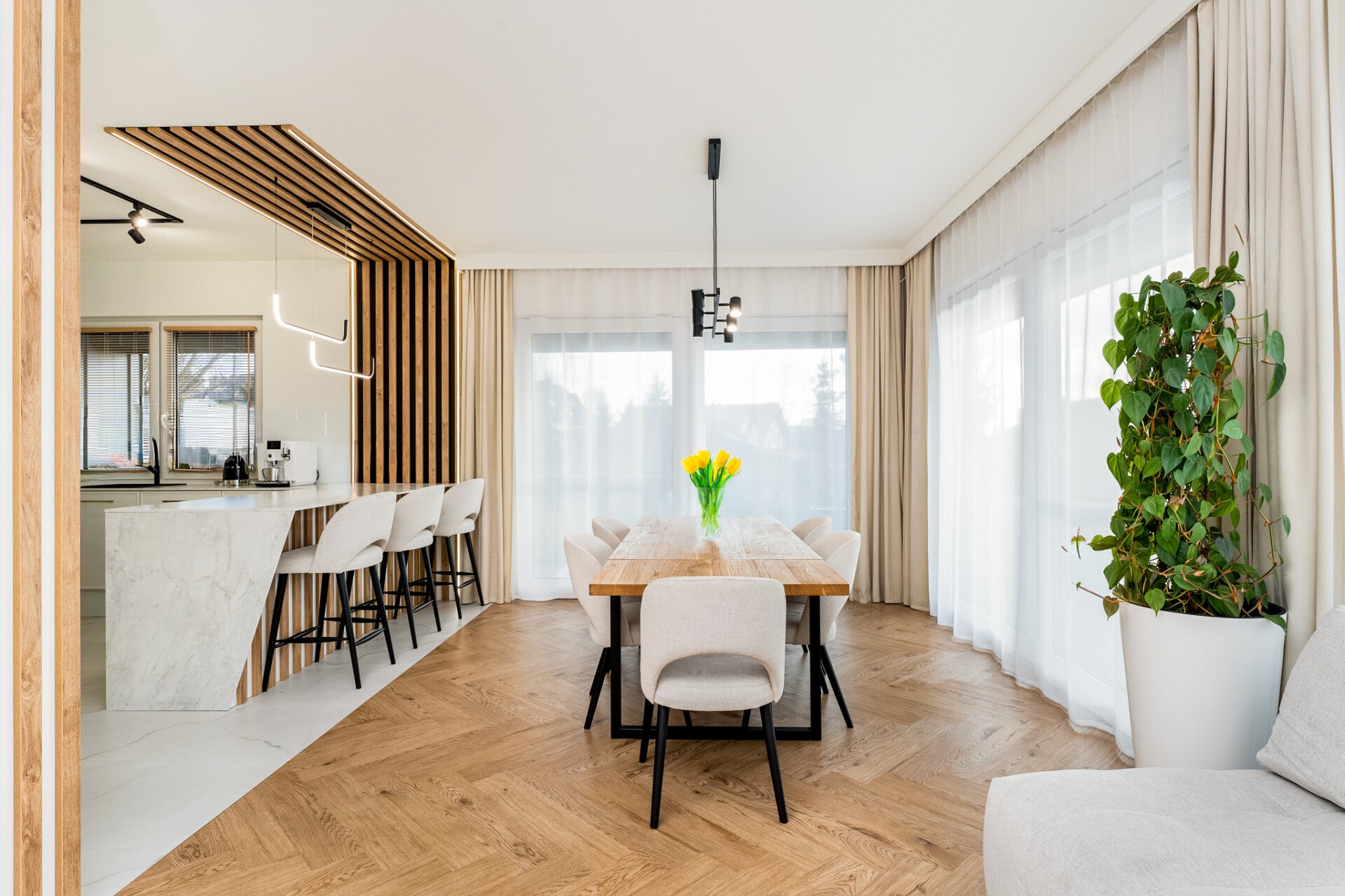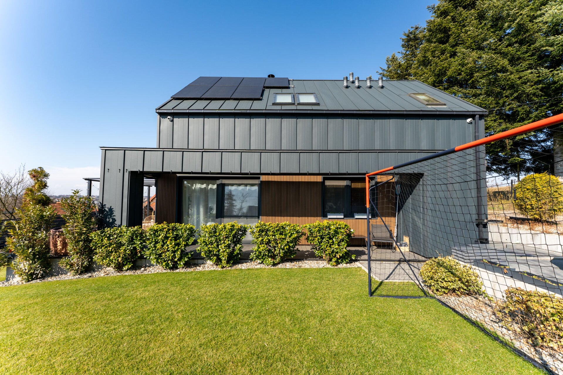 - duże przeszklenia, okna 3-szybowe Wiśniowski, kolor antracyt od zewnątrz, rolety plisowane na oknach dachowych, rolety drewniane w kuchni i w pokoju na dole