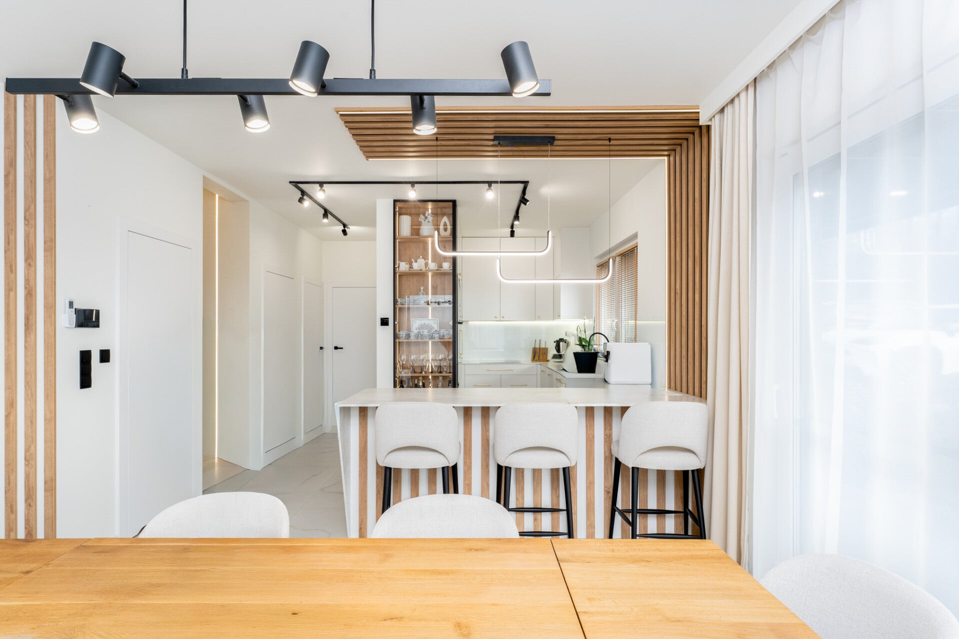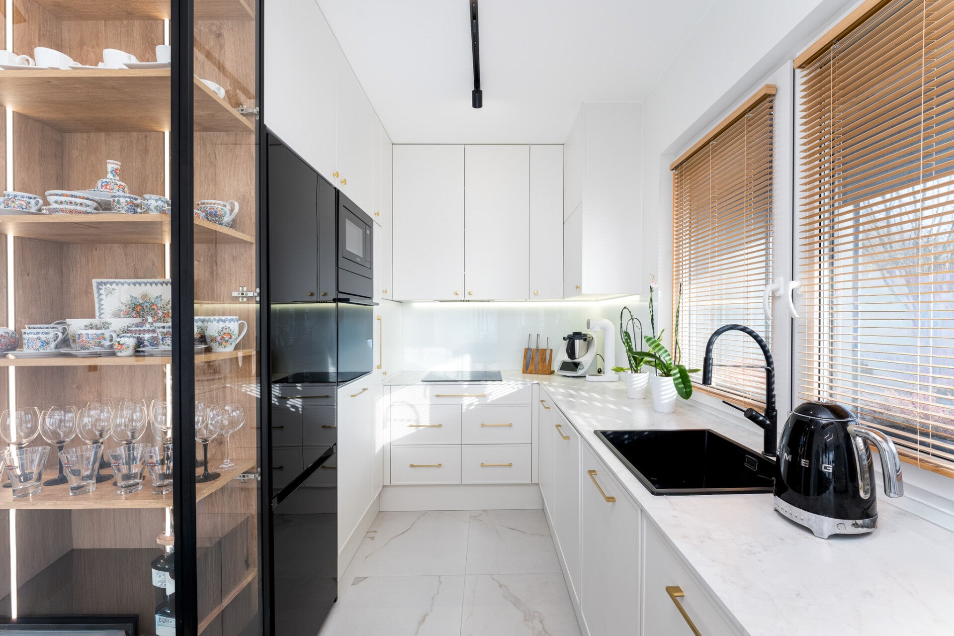 - otwartej, wydzielonej kuchni z dużą ilością blatu roboczego
